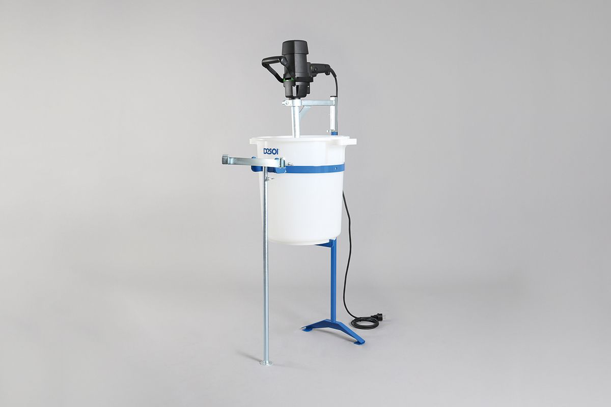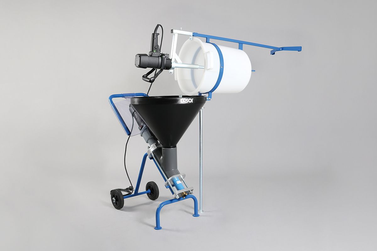 The add-on mixer with tilt mechanism DESOI Power-Mix-ABR-1.1 has been optimised for the perfect mixing of mineral materials with grain sizes 0 - 4 mm. The special design of each single cup ensures a gentle and homogeneous mixing of the material without air intake all over the mixing container. Using the mixer holder, the mixing device works automatically while the injection work is carried out (1-person-operation). The tilt mechanism allows an ergonomic decanting of the fresh material from the mixing container into the material container of the screw pump SP20.